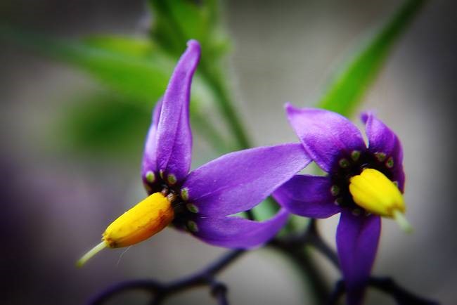 This plant is found in southern Eurasia. Don’t eat it! All parts of the plant are poisonous. It has dull green leaves, purple flowers, and shiny black berries the size of cherries.